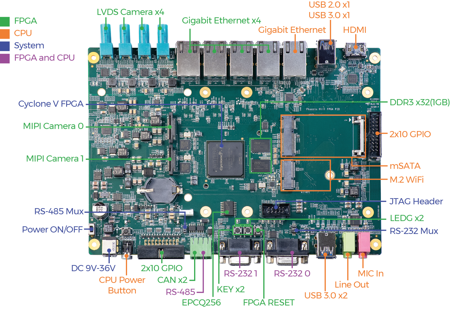 开发板 基于X86+FPGA的多接口融合开发平台开发平台由PIB底板和X86核心板构成,其中PIB底板是一块以FPGA为核心的可编程外设接口板(相当于一块电脑主板);而X86核心板是一块集成了X86 CPU,内存接口的核心板,将两者组合在一起,相当于一台完整的X86主机系统。 PIB底板FPGA型号:CycloneV GT(5CGTFD9) 逻辑资源:301K LE FPGA侧存储:1GB DDR3 5个千兆以太网口 4个GMSL LVDS Carema接口 2个MIPI Camera 接口 X86核心板CPU:可选Intel Tigerlake i7,i5或i3 内存:1 SO-DIMM插槽,最大支持32GB DDR4 外存:1 mSATA插槽,可选256G,512G或1T SSD